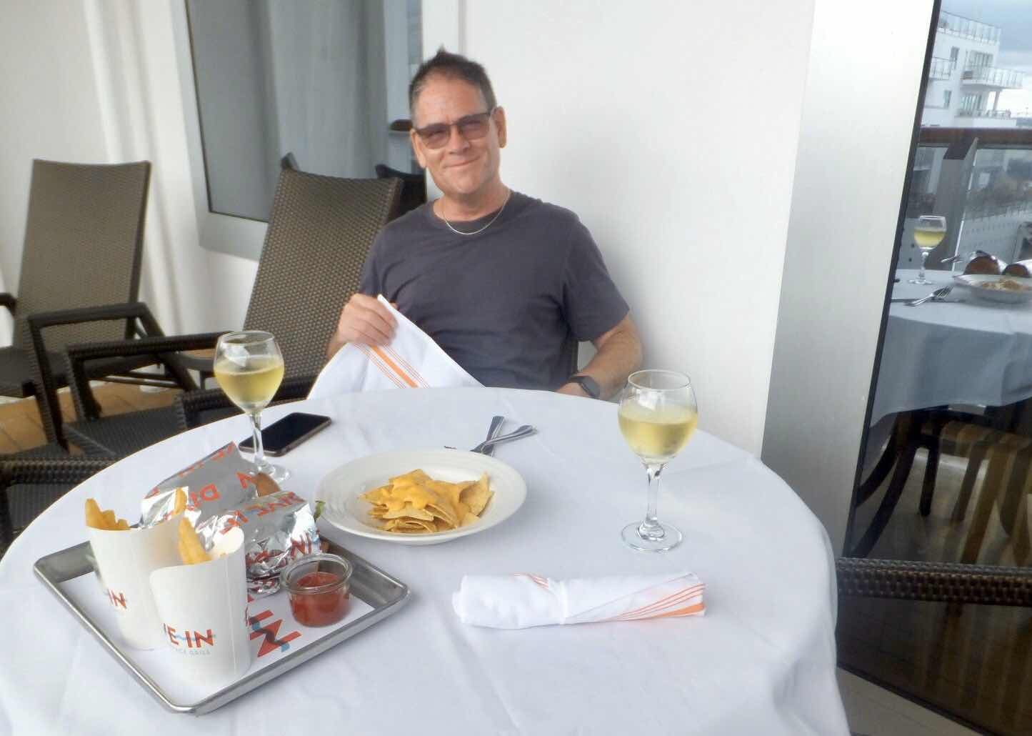 It's time for a late lunch and we're feeling that there's not been enough beef recently so we order burgers from the dedicated burger kitchen and enjoy these on our balcony rather than anywhere else, after which we head up to to nine to enjoy a bit of sunshine and chatter with our railway club, especially the Halifax Four. Mojitos for sailaway should be good today, but sadly a weather front passes by just at the time we're pushing off and rain stops play for most, although I'm in wet shorts so I don't care - it's not cold!!