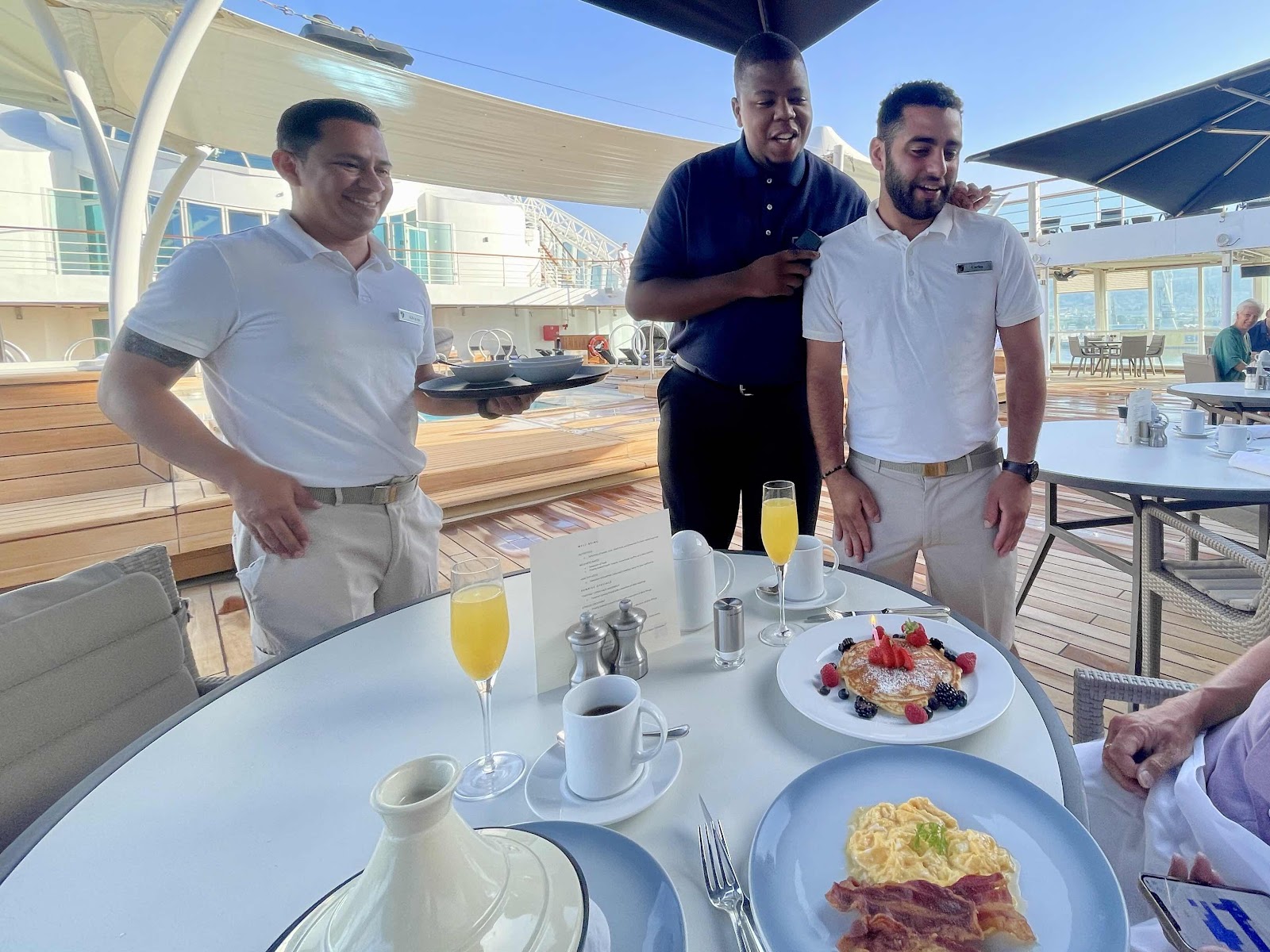Birthday celebrations commence at the poolside grill at breakfast, with Mimosas (Buck’s Fizz) and alongside what we have ordered comes a birthday pancake with mixed berries and staff rapping a birthday jolly.