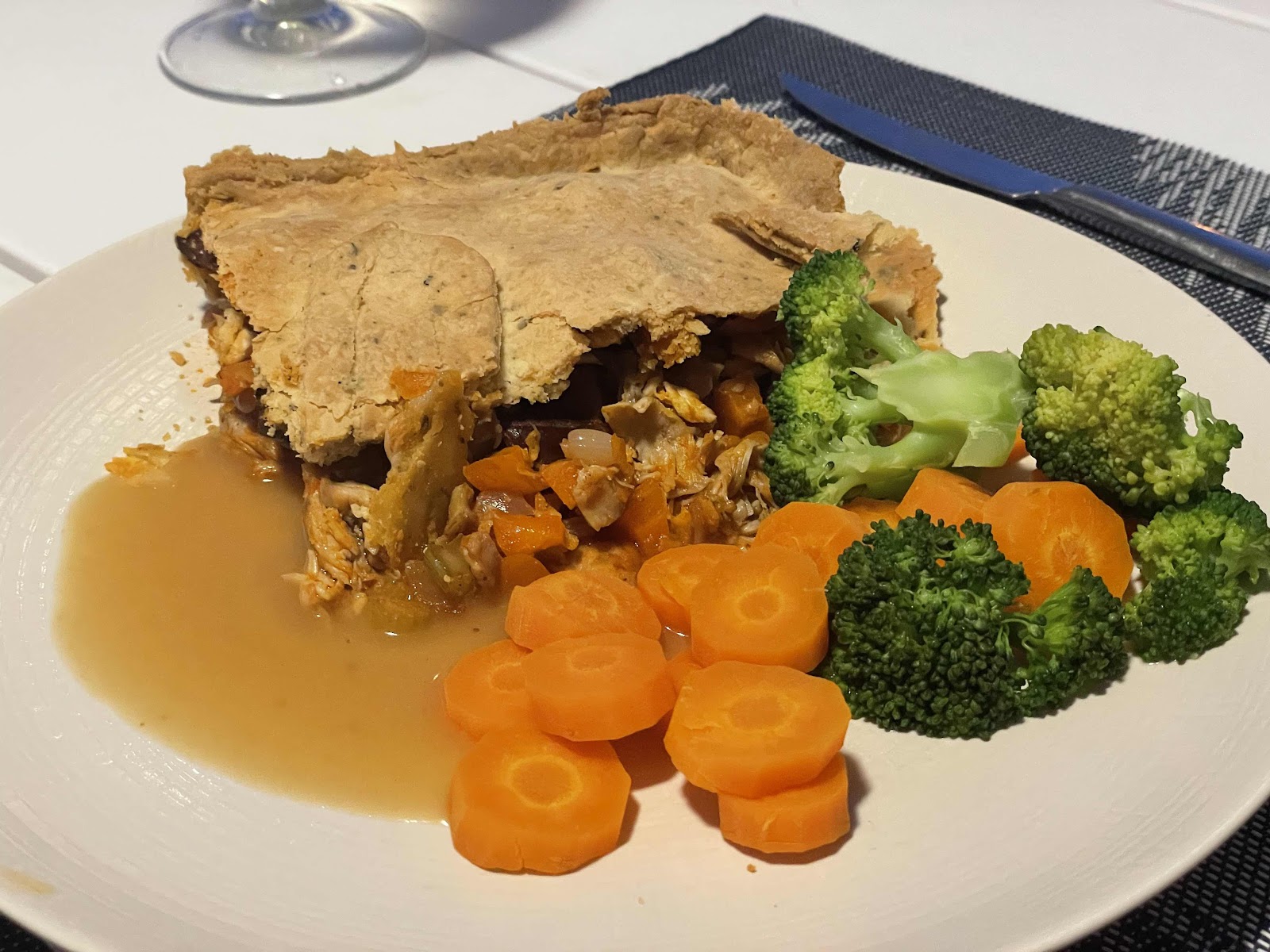 Back before lunchtime we’re working as usual until pool-time, then more walkies, finally roasted cod in red pepper sauce with Parmesan crust, except I use Grana Padano here.